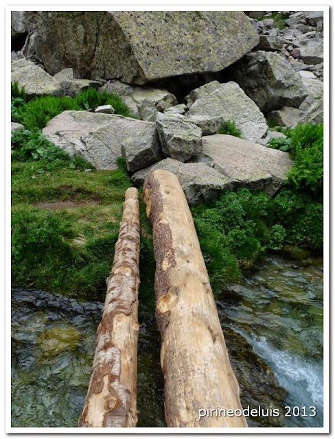 El puente que había ha sido arrastrado por las aguas como en otros valles y sustituido por un par de troncos