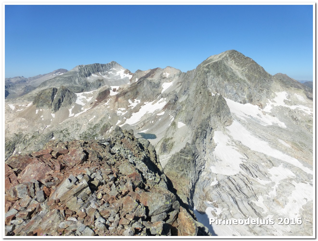 Dos grandes crestas se solapan en la foto, la cresta de Cregüeña al pico Maldito y la cresta de Llosás al Aneto