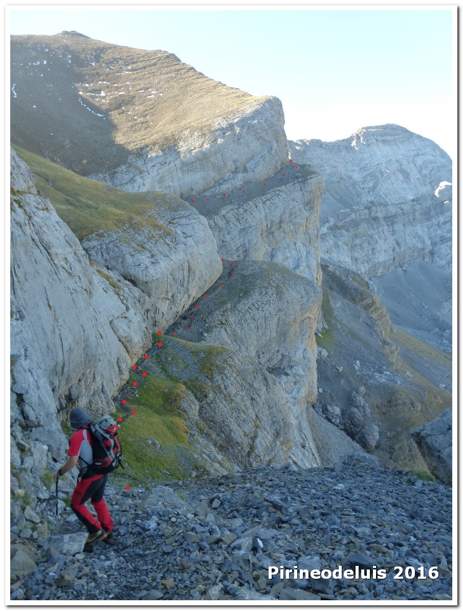 La faja de Escuzana llega a su final y pronto nos desviaremos a la izquierda para remontar las palas hacia el pico Escuzana y Mondarruego (este último se ve en la parte superior de la foto)