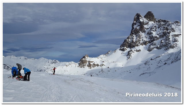 Mi idea inicial era hacer una escapada mañanera hasta el pic de Peyreguet para aprovechar la nieve polvo que había caído los días previos pero al final reduje la actividad ascendiendo hasta el hermano pequeño, el pic de l'IOu al Oeste del collado homónimo. Al llegar al collado pegaba un viento bastante fuerte y la pala de ascenso hasta el Peyreguet estaba con nieve dura y me dio pereza sacar los pinchos. Creo que casi todo el mundo pensamos lo mismo y nos acercamos hasta esta pequeña cima antes de iniciar el descenso.