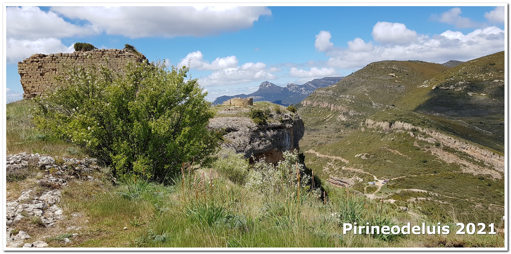 las edificaciones de la antigua ermita y fortificación. Al fondo la peña Gratal