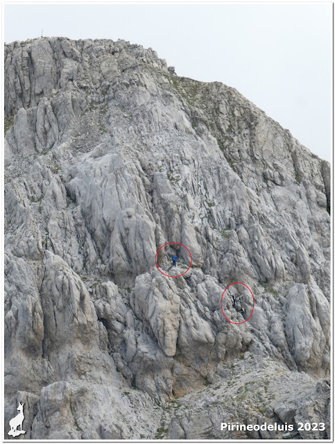 tres montañeros con los que coincidiré más tarde en la cima del Solola Bajo. Desde aquí se aprecian mejor las viras por las que se sube desde la brecha