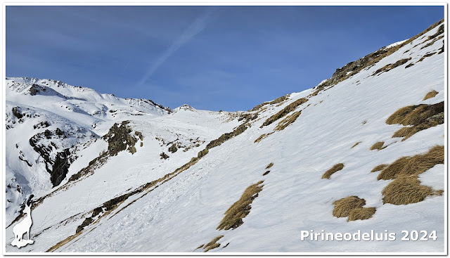 este sector por debajo de la cresta de los Faballons al ser Sur está un poco justa de nieve y toca ir esquivando los bloques