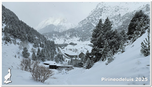 Durante la madrugada ha comenzado a nevar y por la mañana todavía continúa por lo que hoy toca un plan sencillo y con poco compromiso. Desde Llanos del Hospital decido ir al Forau y plan de Aigualluts. Iré alternando momentos de ventica con otros de calma, pero es un itinerario que conozco bien y que no tiene excesivos peligros, así que me voy para allá
